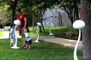 綠茵如織的草坪上,一朵朵如3歲小孩高、潔白真菌狀的藝術品嵌在其中。當民眾靠近任何一朵真菌時,波麗露舞曲交響樂的主旋律隨即宣洩而出;當第2位民眾走進真菌時,打擊樂為基底的副旋律美妙響起。這是台北藝術大學與淡江大學共同完成的「無線感測真菌人文樹道」,讓民眾散步於樹道間,都可以是音樂指揮家。