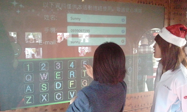 透過82吋互動觸控螢幕,民眾先輸入自己的姓名與聯絡方式,稍後打造一張屬於自己的賀卡,LG也可以擁有客戶的資料,針對客戶進行優惠行銷。